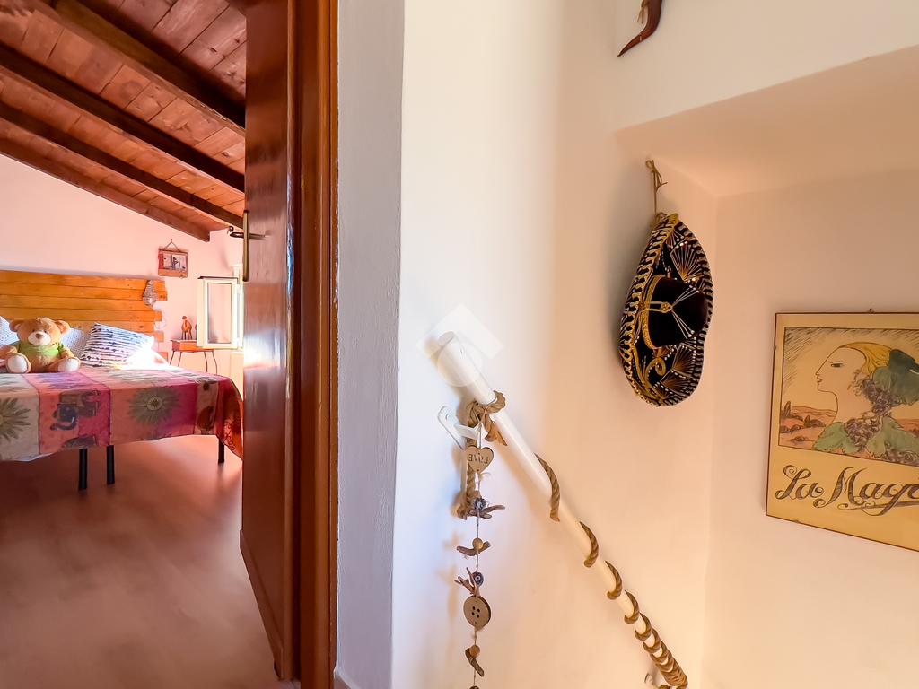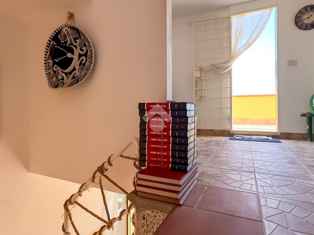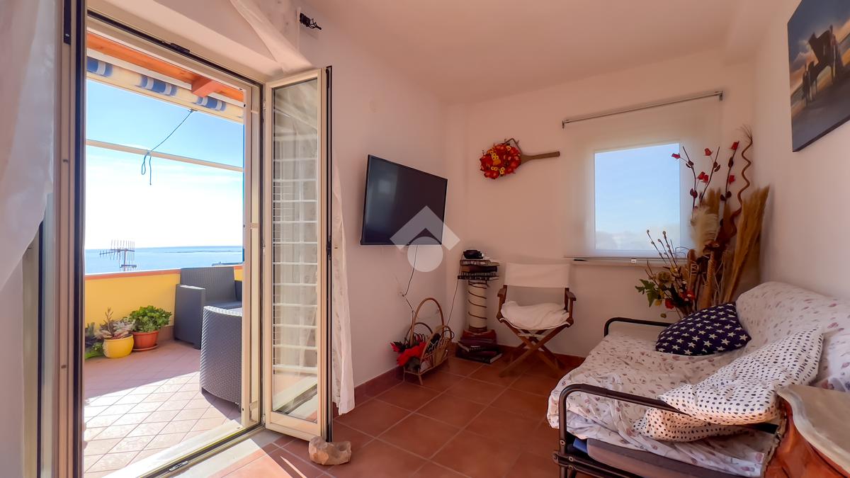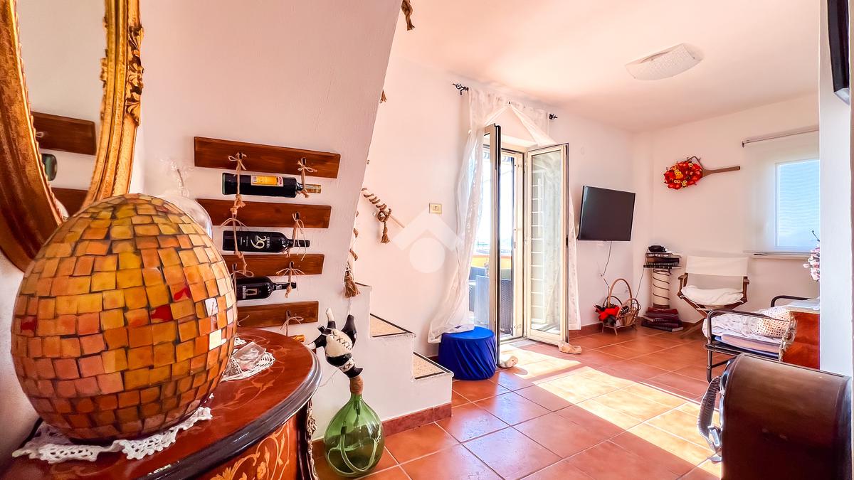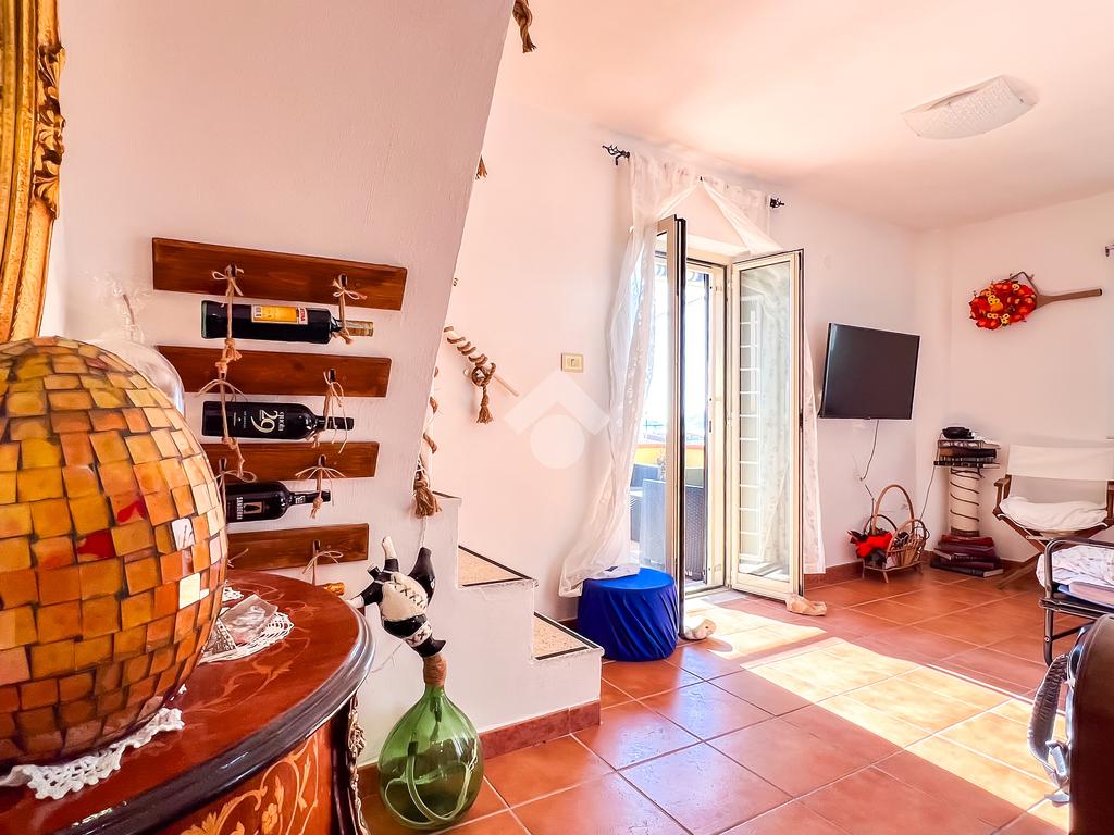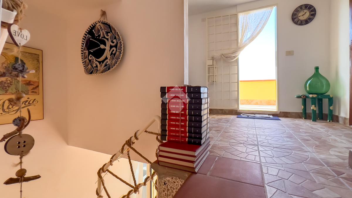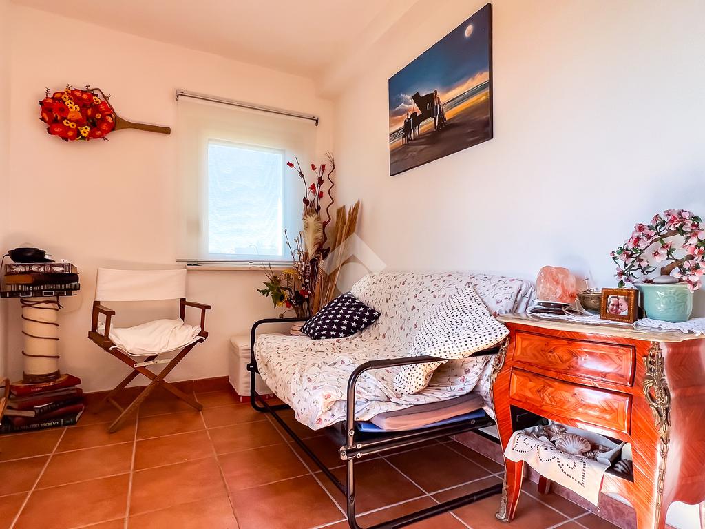 Attraverso una scala interna situata nel soggiorno si accede al secondo piano, dove si apre la zona notte, composta da un disimpegno, due camere da letto, di cui una con bagno privato, e un ulteriore bagno a servizio del piano. Dal disimpegno si accede al secondo terrazzo vista mare, ideale per ammirare tramonti e momenti di tranquillità. Completa la proprietà un locale di pertinenza, utile come deposito o ambiente di servizio.