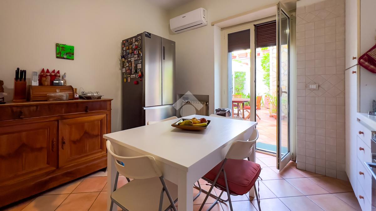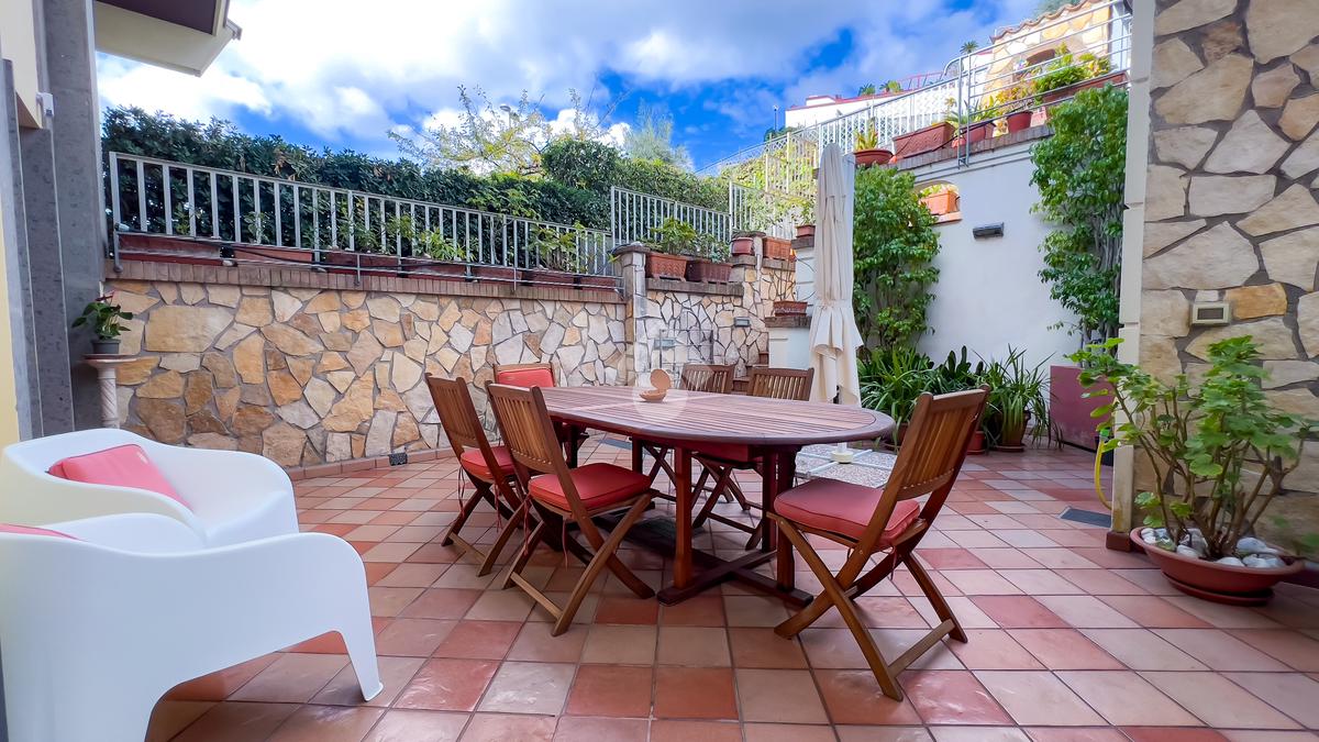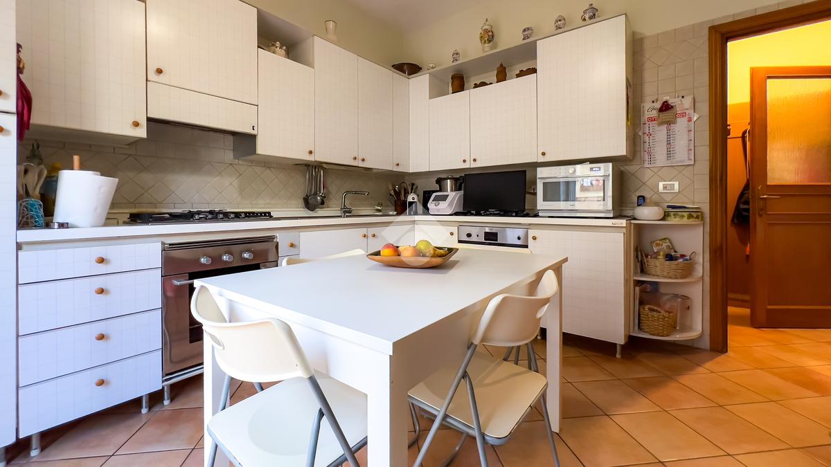 Il piano giorno accoglie una luminosa zona living con accesso diretto al patio pavimentato, perfetto per vivere momenti conviviali all’aperto, e una cucina abitabile che si apre sul medesimo spazio esterno, creando continuità tra interno ed esterno.