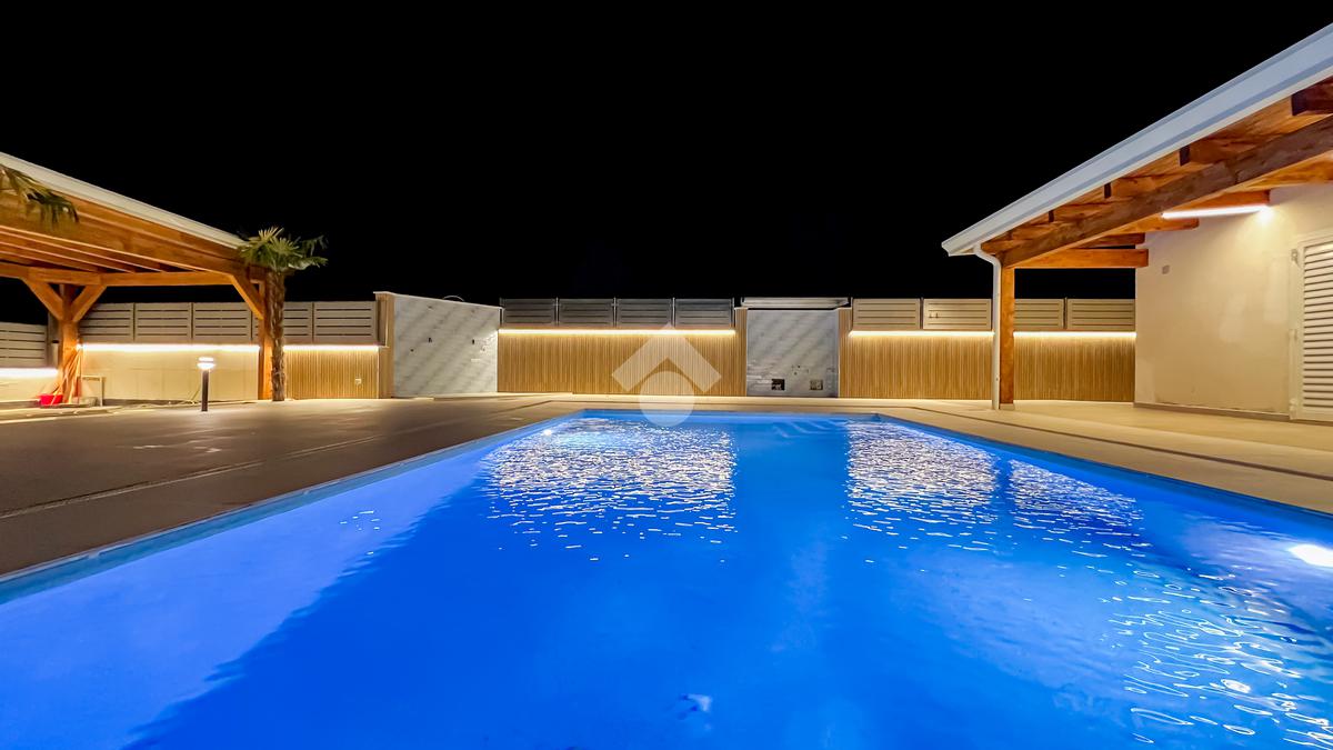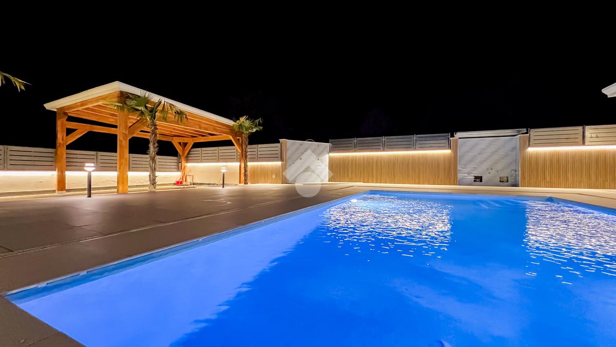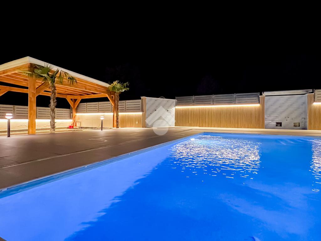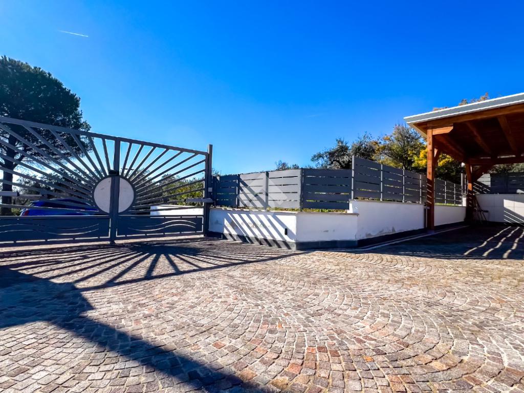 All’esterno, ogni elemento contribuisce a definire il carattere della villa: la doccia a servizio della piscina, il gazebo in legno per le auto, la cura delle finiture, la pavimentazione della corte, la luce soffusa che valorizza gli spazi nelle ore serali. Nulla è lasciato al caso, perché qui anche il dettaglio partecipa alla qualità complessiva dell’abitare.