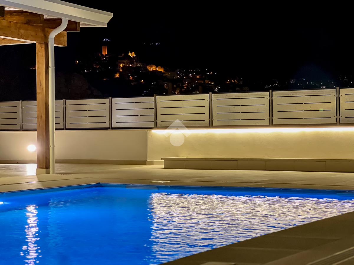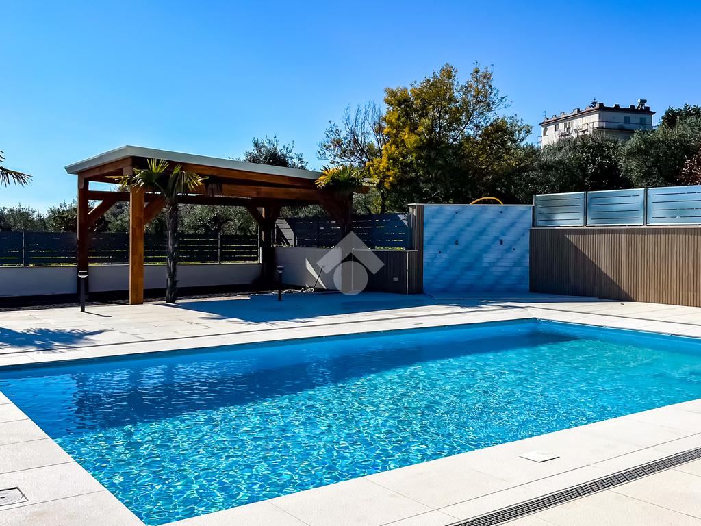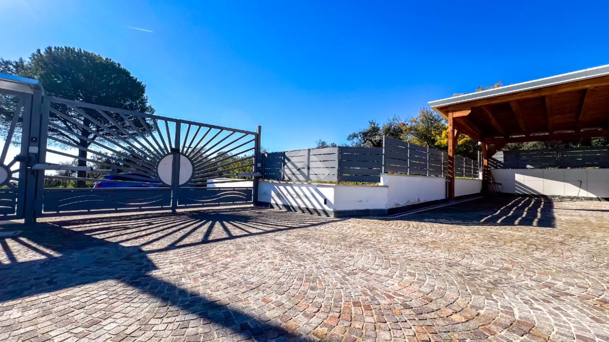 Dal cancello automatico si accede alla proprietà, dove l’impatto è immediato: la piscina, il verde, la luce, il panorama e il porticato in legno costruiscono fin dal primo sguardo una sensazione di armonia e distinzione. Tutto appare coerente, misurato, raffinato.