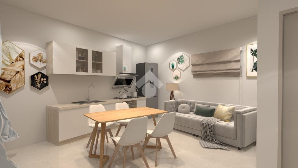 L’ingresso conduce al soggiorno con angolo cottura, ambiente funzionale e ben organizzato, con uscita su un balcone panoramico che offre una vista aperta sulle montagne circostanti.